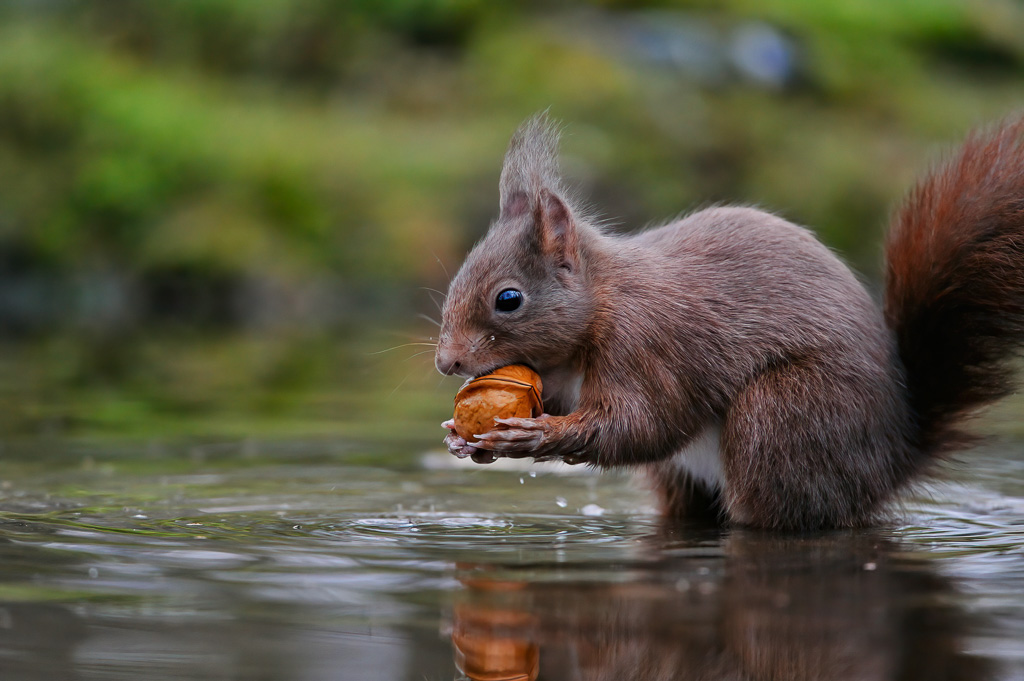 A red squirrel collecting walnuts fallen in the water for winter