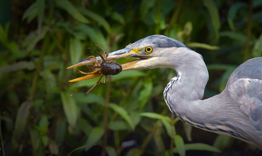 A blue heron is hunting crayfish in Alblasserdam, The Netherlands