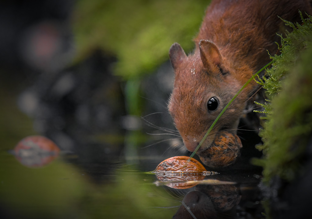 Red squirrel collecting nuts dropped on the water for winter